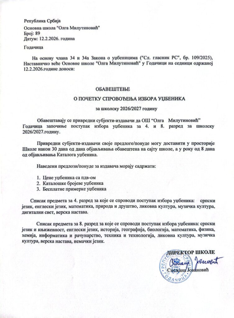 Обавештење о почетку спровођења избора уџбеника за школску 2026/27. годину